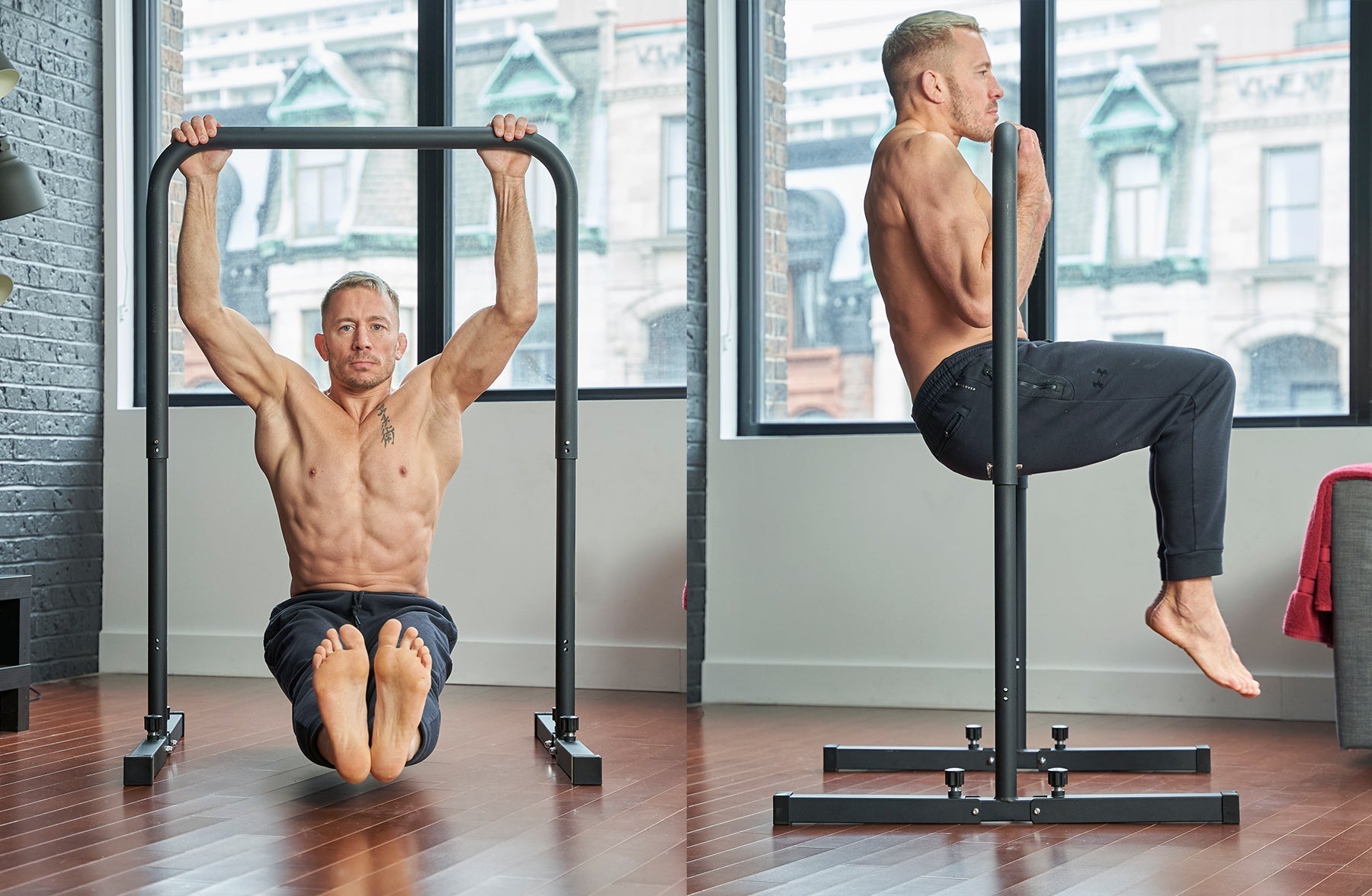 Meet the BaseBar Pro – the debut product in the Georges St-Pierre collection. Height-adjustable for a complete back workout and foldable feet for easy storage. Perform horizontal pulling exercises on the 92cm height (rows and levers) and vertical pulling and core exercises on the 138cm height (pull-ups and leg raises). Fast setup with quick-release clickpins and feet that fold, then rotate for flat, compact storage. Completely freestanding and travel friendly – take your workout anywhere.